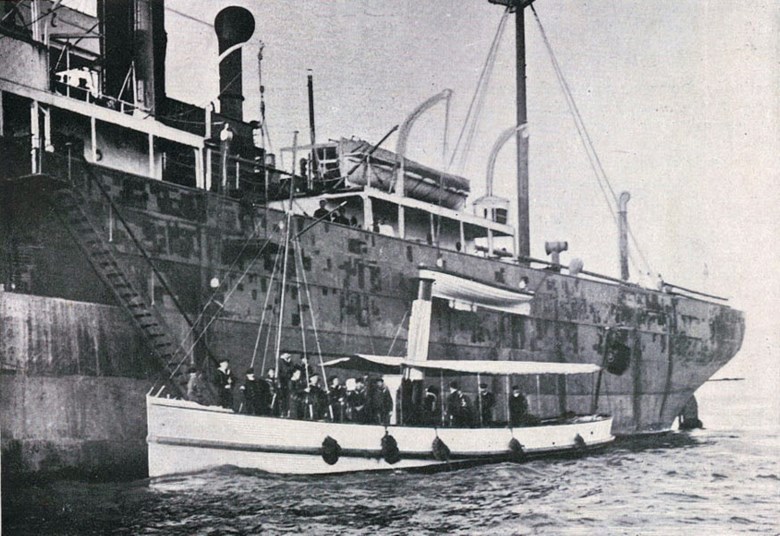 O vapor “Cisne”, junto de um vapor alemão, conduzindo as forças da marinha que tomaram posse dos navios alemães, Março de 1916 Joshua Benoliel/Arquivo Municipal de Lisboa